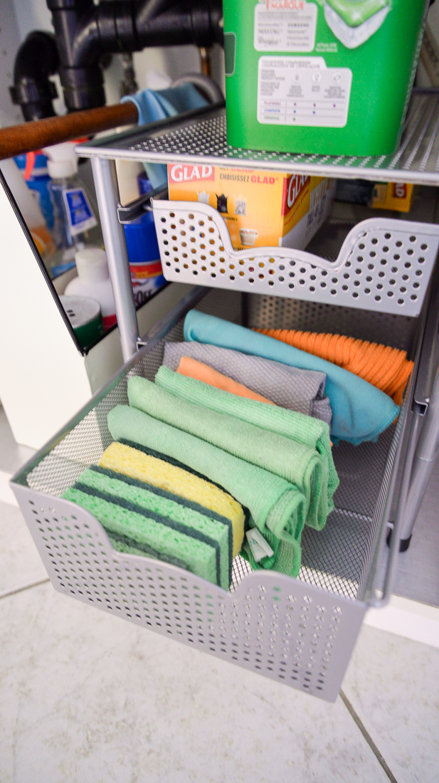 I love this tiered organizer so much, I've bought it twice. I use one in our cottage bathroom to hold the hair dryer, brushes and extra soaps, and the other one keeps the area under our kitchen sink very organized.