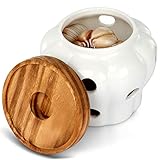 Excellent ventilation design the 12 vents are designed to maximize the amount of ventilation in the garlic keeper ceramic for counter which keep the garlic cool and dry The lid of the acacia wood can protect the garlic from being exposed to the sun making garlic a longer shelf life