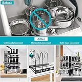 MUDEELA - Easy to assemble in 3 methodshorizontal on one side vertical on one side vertical on both sides the sizes and direction of this pan organizer rack can be adjusted according to your needs giving you more flexibility in organizing your pots and pans please measure your cabinet size and carefully read the dimensions of our item before purchase to make sure it fits your cabinet Large storage capacity and compact sizeour pot and pan organizer has 8 tiers allowing you to store 8 and more stacked pots and pans the compact design saves you a lot of space in your kitchen cabinets pantries and on your countertops great pots and pans organizer under cabinet or in cabinet