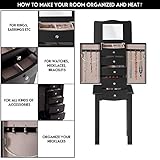 Large mirror organized storage this jewelry cabinet comes with a builtin large mirror on top lid making it easier to dress yourself or put on earrings and necklaces Reasonably divided space on the top can keep your jewelry neat and gracefully displayed meanwhile it make your jewelry easy to access as well