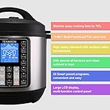 TEKAMON - 23 one touch smart cooking programs convenient cooking saves time including rice multigrain porridge steam egg yogurt pressure cook soupbroth meatstew beanchili poultry bake slow cook saute sous vide keep warm cake dessert pasta pizza canning pie and more With a touch of a button you can safely quickly cook your favorite meals up to 70 faster than conventional cookware Super health and safety multiple safety technology protection made of food grade materials Foodgrade 304 stainless steelnonstick design double bottom inner pot and dual pressure settings for even heat distribution The body is made of special oilproof material excellent air tightness intelligent pressure regulation food nutrition is preserved