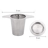 Our tea infuser has two handles so that it can rest properly on the cups edge and fits most standard cups mugs tea pots Easy to put in and take out Wont fall into big mugs and wont float like others Include 4 pack tea strainers 5 inch width by 3 inch height Each is consist of extra fine mesh filter with two handles and separate lid All two parts are made of 188 stainless steel easy to clean and dishwasher safe