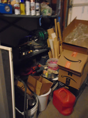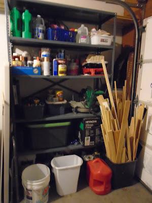 Our garage is still very much a work in progress. Not too long ago I added more storage shelves to our garage but I'm still working at decluttering and organizing what we keep there. Last year I got our décor culled down and finally into labeled bins. This year I wanted to work on the tools and DIY items I have on our metal shelving next to our chest freezer. I went through everything and was able to corral all of my power tools along with their blades and manuals into a new bin I picked up at Wal-Mart. I got rid of items I no longer need or use and re-organized what was left. Each shelf has a purpose - the top shelf is for automotive, the next shelf if for my tool box, fasteners and my compound miter saw. The next shelf houses my new power tool bin and some DIY items. The bottom shelf is for lawn and garden supplies. I am very pleased with how I have things now and with how much I was able to part with.
