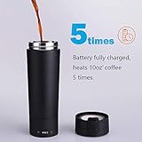 Longlasting battery for multifunction heated coffee travel cup is equipped with a rechargeable 9600mahcapacity battery it takes about 3 hours fully charged The mug can keep the drink hot for 6 hours it also can heat 3 cups of 10 oz drink to 122f or heat 15 cups to 176f The inside battery can also be a power bank to charge your mobile phonecharge iphone x 2 times