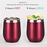 Easy cleaning hand washing is recommended electropolished interior doesnt transfer flavor no metal aftertaste you dont have to worry about your morning coffee or afternoon teas being ruined Durable and bpafree wine tumbler this 12oz wine glasses is made with highgrade 304 188 food grade stainless steel antirust and lead free unbreakable and stands up to heavy use through every seasonClear presson lid helps you see whats inside