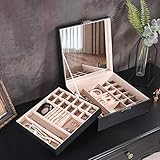 BEWISHOME - Perfect size and gorgeous on dresser overall dimension d x w x h 1025 x 1025 x 375 Wellconstructed elegant compact and spacious at the same time this gorgeous will keep all your favorite jewelry in one place and easy to find Outstanding craftsmanship and elegant look made from high quality black pu leather cover refined velvet interior welldone seams this wellbuilt jewelry box is sturdy as well as elegant Large bulitin mirror and one hand easy open buckle large builtin mirror adds convenience when you try your jewelry on delicate antirust shining knob allow you open and close it in seconds by one handed operation very convenient and no time consuming Silk handles on the top layer makes it easy to carry around when needed