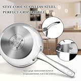 Silicone wrapped handle for comfort and stays cool riveted handle for durability Made of mirror polished 1810 stainless steel for appearance and easy cleaning