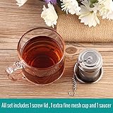 Unlike traditional tea ball or twist lid infuser our tea strainer features threaded connection design that youll feel easier to open and close when using Besides it seals more tightly so tea leaves will not leak out during the process of brewing Set includes 1 screw lid 1 extra fine mesh cup 1 saucer for avoiding making a mess when taking out All the parts are made of 188 stainless steel Odor chemical free Easy to clean and dishwasher safe