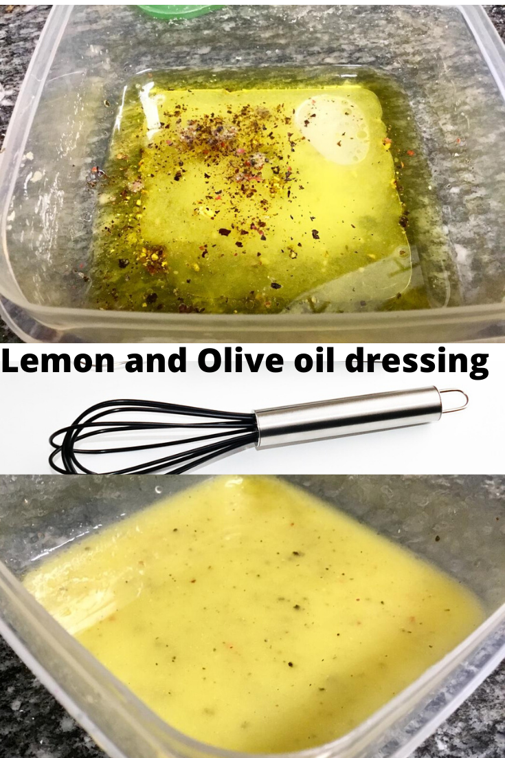 Once you mix the olive oil, fresh lemon, salt and cracked pepper, use a whisk and beat it until creamy |