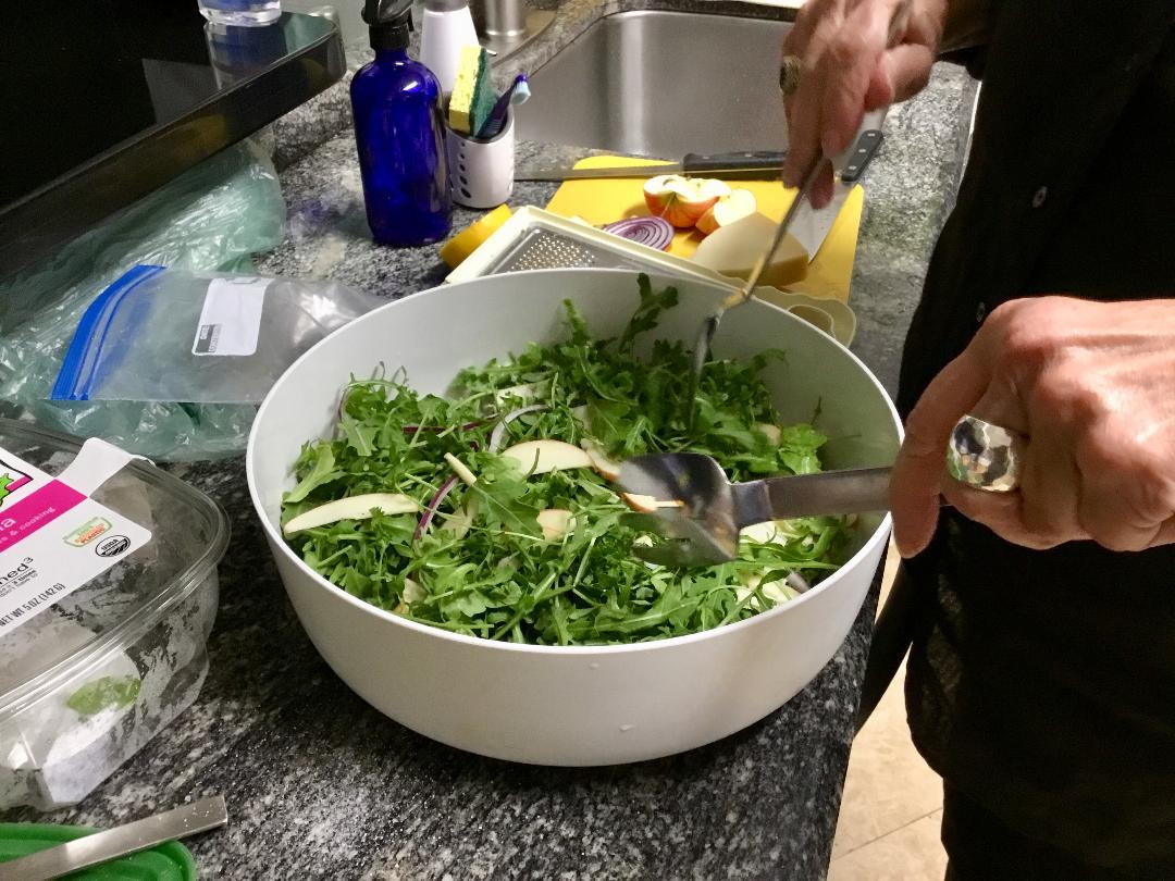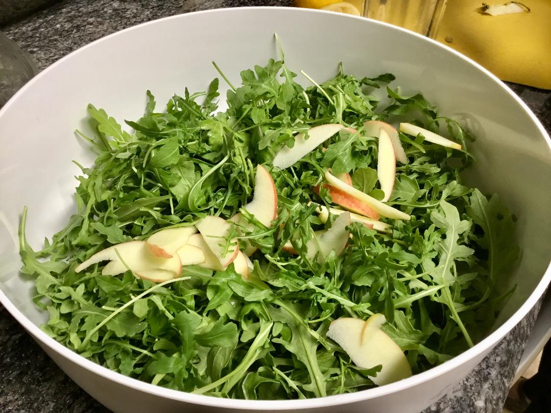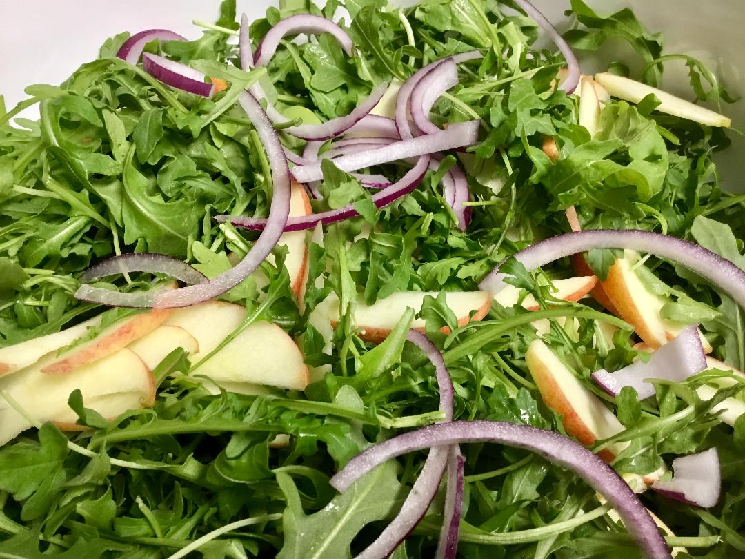 My friend Yda, who is an exceptional cook, makes a great arugula salad with shaved Parmesan and slivers of apple and slivers on red onion. It is simple to make, tastes amazing, and is very appealing. She dresses the salad with fresh lemon juice and olive oil mixture. The entire prep is less than 10 minutes, but looks good enough for company.