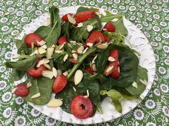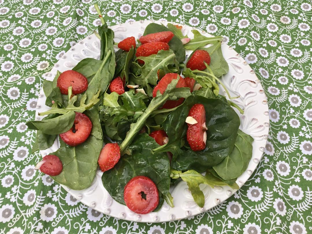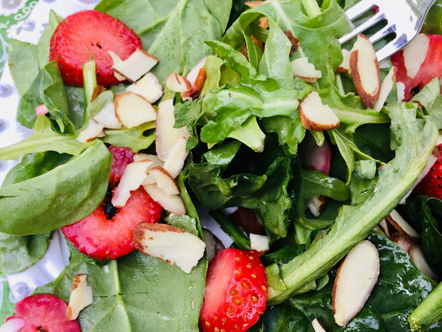 Summer is the perfect time to enjoy flavorful healthy greens and sweet produce. I've made this beautiful arugula, baby spinach, and strawberry salad with an option of including some colorful chopped mango or sliced almonds as well.