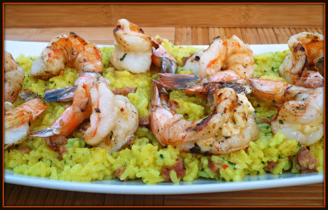 Step 4: Spoon the pilaf onto a serving platter. Remove the toothpicks from the grilled shrimp and arrange them on top of the pilaf. It really makes an eye-catching presentation!