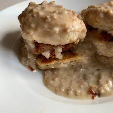 What a great supper dish, and it’s all from one skillet. Homemade fried tomatoes–they should be firm, but hey don’t have to be green-- combine with ready-made sausage gravy to make a meal. Complete the meal with hot biscuits and honey butter.