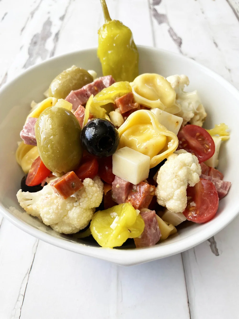 Yield: 8Author: The Skinny Fork (Amanda Plott)Prep time: 5 MinInactive time: 1 HourTotal time: 1 H & 5 MAn Italian pasta salad that's easy to make and super delicious. Cheese tortellini, pepperoni, salami, mozzarella, and plenty of veggies!Ingredients