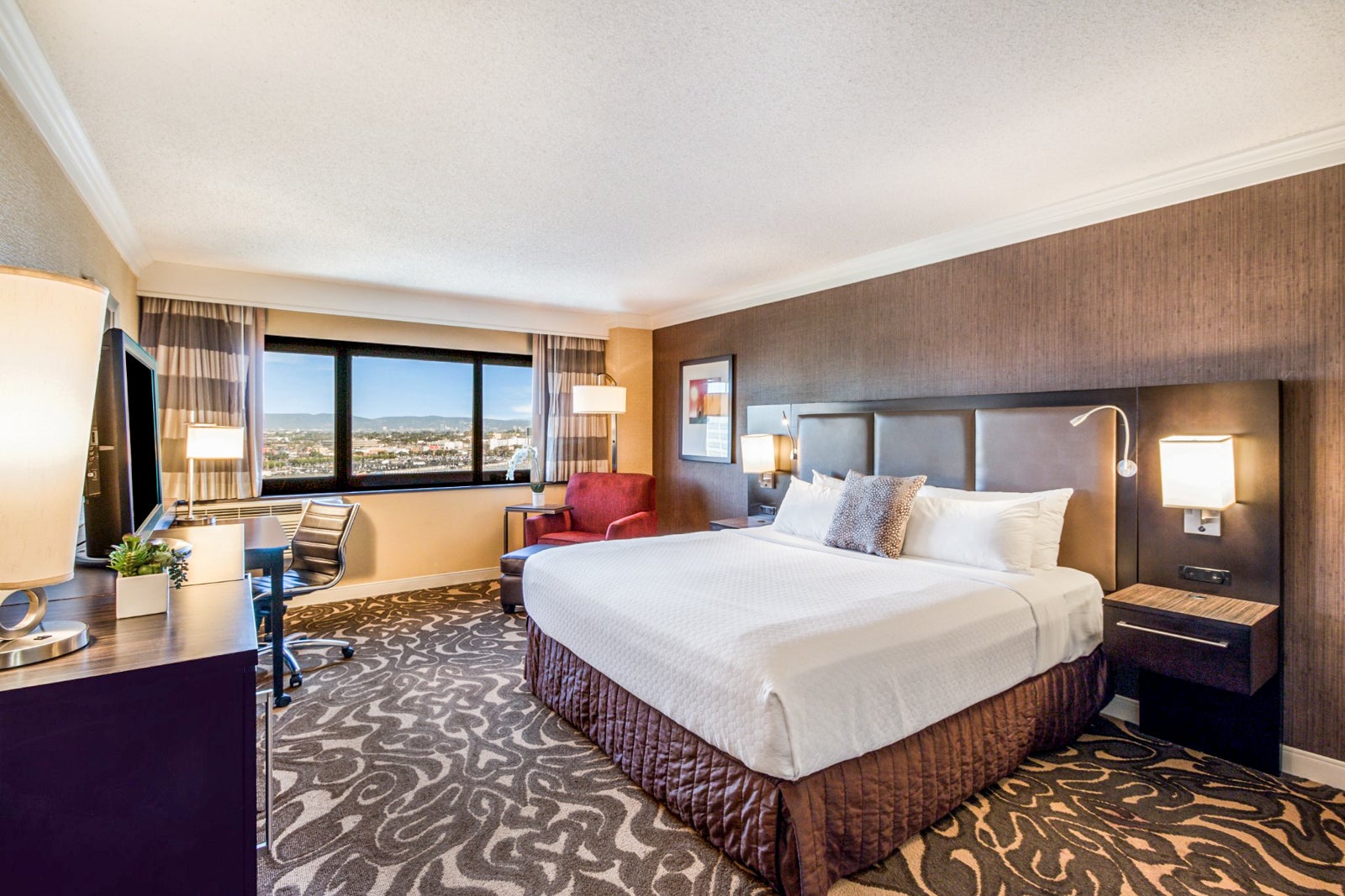 This 18-story, 1,004-room hotel underwent a $44 million renovation a few years ago. Accommodations now have a fresh, airy look with bright white, sky blue and contrail silver accents. Also, the floor-to-ceiling windows let in plenty of California sunshine. Rooms start at 265 square feet, and include pillow-top beds and 55-inch televisions to make your stay comfortable.
