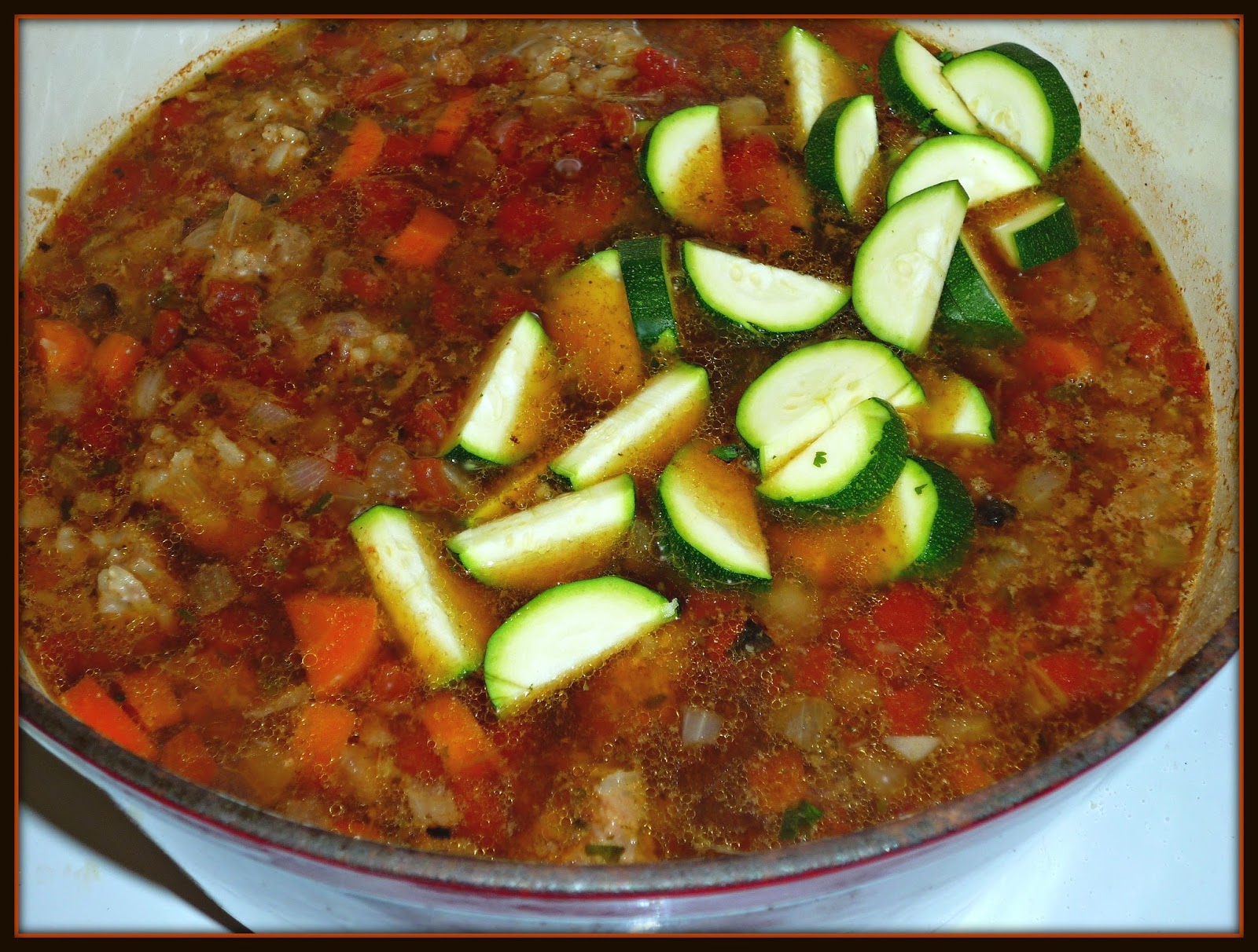 Step 3: Add beef broth, diced tomatoes with chiles, and cumin to the mixture. Add salt & pepper to taste. Bring the soup to a full rolling boil. Reduce heat to Med-Low, cover, and cook for 20 minutes. Add zucchini, give the soup a stir, and cover. Cook an additional 25-30 minutes -- until the zucchini is cooked, but not mushy.