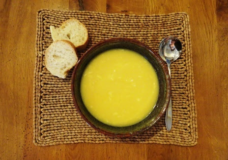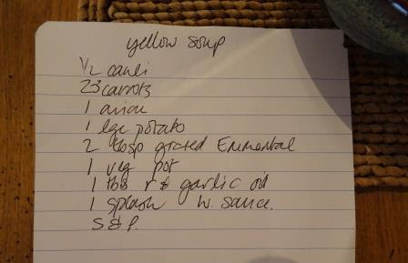 I have got into the habit of writing down the ingredients I used each time I make soup so that I can make it exactly the same if it turns out really well. Which this one did - and it was bright yellow!